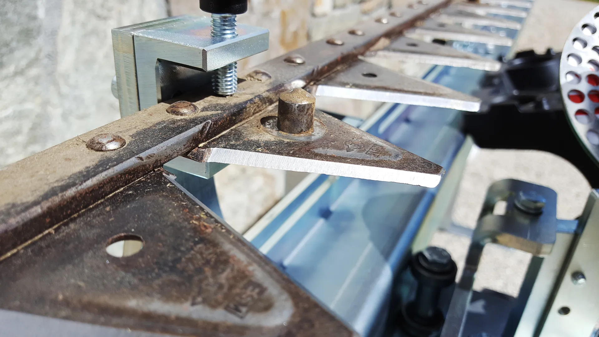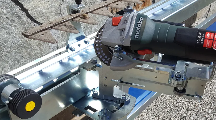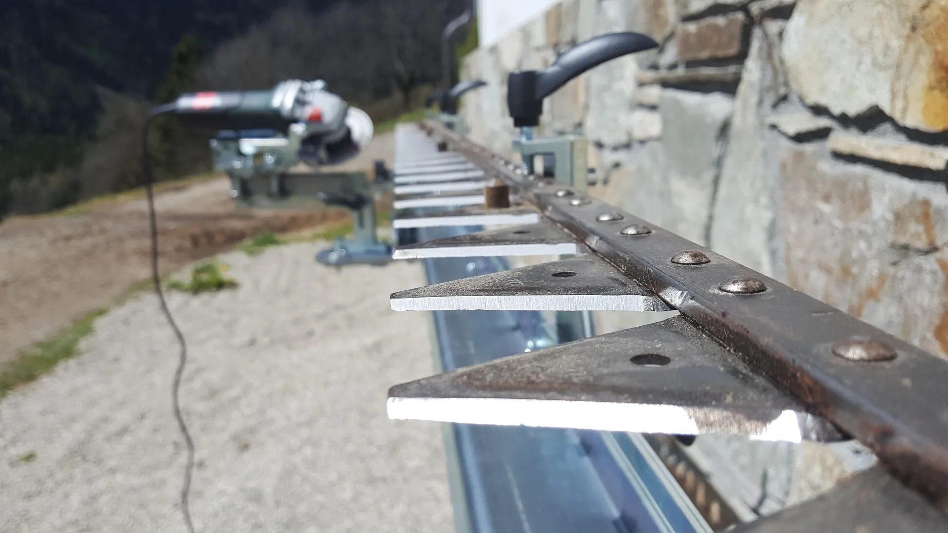 Das Mähmesser wird bequem über die verstellbaren Halter eingespannt und muss während des Schärfvorgangs nicht weiter ausgespannt werden.Das Schärfen der Klingen erfolgt dann über eine geführte Bewegung mit dem Winkelschleifer. Dieses Konzept ermöglicht eine enorme Zeitersparnis im Vergleich zu herkömmlichen manuellen Schleifgeräten.