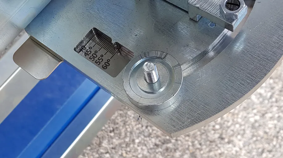 Eine einfache Handhabung garantiert das Drehrad als Positionshilfe am Führungswagen. Mit ihm kann auch der Druck auf die Schneide während des Schärfens reguliert werden. Spielfreie Führungsschienen gewähren eine präzise und leichtgängige Schleifbewegung des Winkelschleifers.